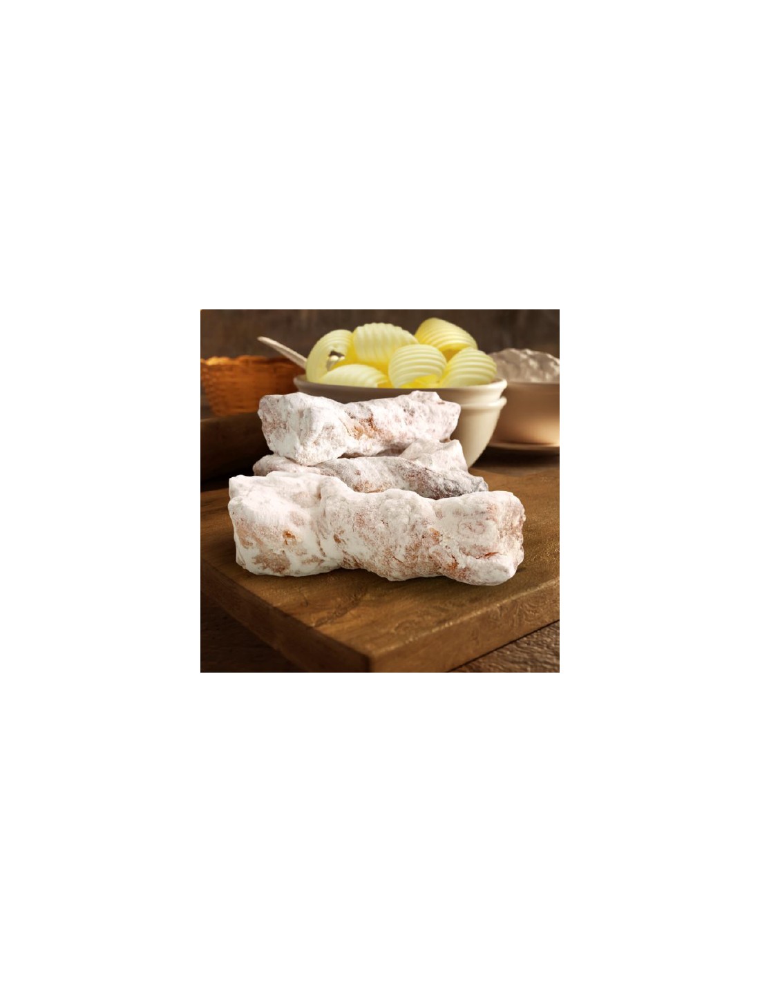 Lazos de hojaldre bañados con un toque de miel con un fina capa de zúcar glas.