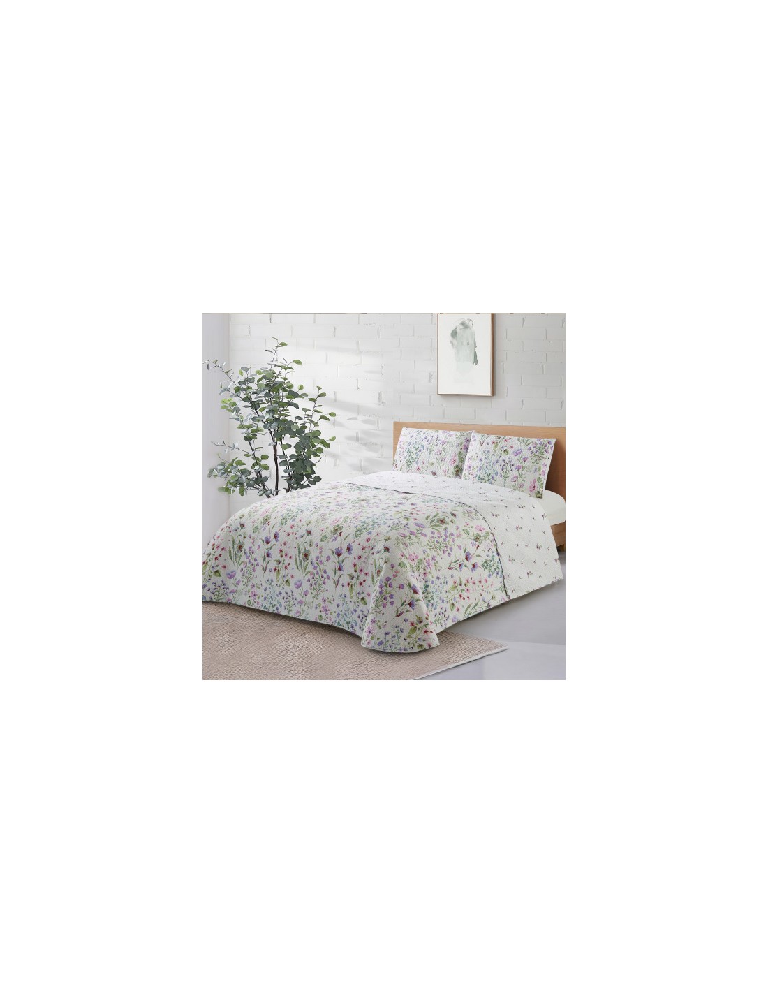 Cama 135 cm. Medidas: 235 x 270 cm. Con 2 fundas de cojín de 50 x 70 cm. Reversible.